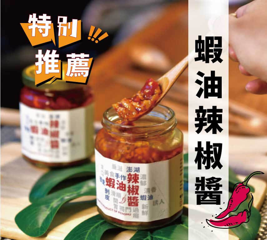 來自澎湖狗蝦蝦油和在地小農的特製辣椒醬。精煉來自狗蝦的蝦頭和蝦殼的濃厚蝦油,加上在地小農種植的辣椒成就了這一瓶 「 蝦油辣椒醬 」 。
